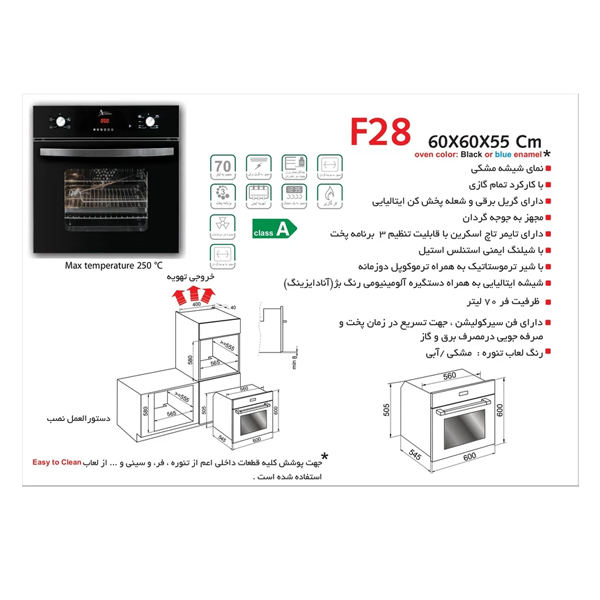دارای ترموکوپل دو زمانه, دارای شیر ترموستاتیک, دارای شیلنگ ایمنی استنلس استیل, دارای فن داکتی داخلی جهت یکنواخت کردن حرارت, دارایدارای شیر ترموستاتیک